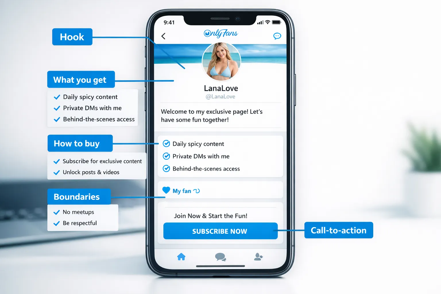 A bio is not just about sounding hot. It is about reducing uncertainty (what do I actually get?), building trust (are you consistent and real?), and creating a clear next step (subscribe, DM, or check the pinned post).